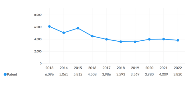 From 2013 to 2017 patent suits filed dropped by 35% and stayed that way through 2022. Excluding volume patent litigation filers, typically non-practicing entities (NPEs)