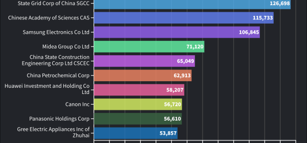 Six of the top ten companies with the most growth in U.S. patent grants are based in East Asia, an indication that a new patent