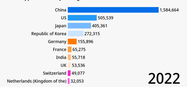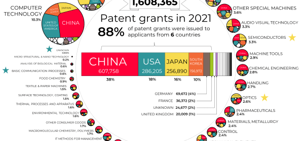 China is the undisputed leader in global patent grants according to data provided by the UN’s World Intellectual Property Organization, with 607,758 issued in 2021,